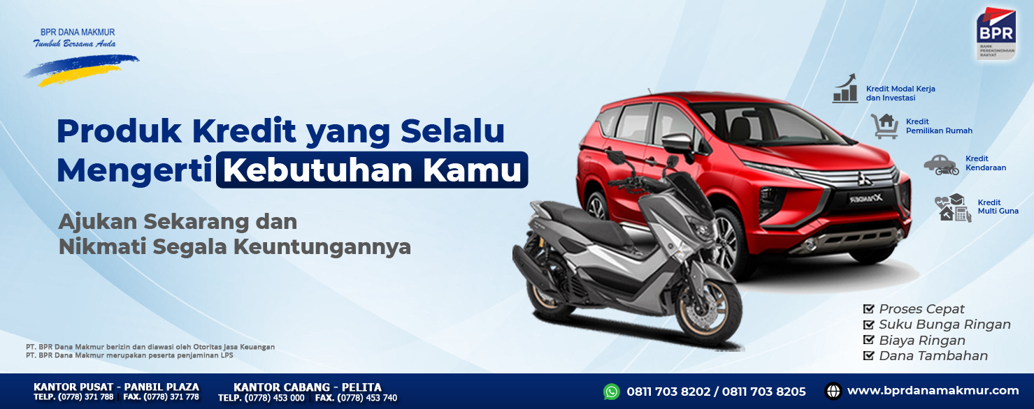 Kami Menyediakan Berbagai Jenis Kredit diantaranya Kredit Pemilikan Sepeda Motor (KPSM), Kredit Pemilikan Rumah (KPR), Kredit Pemilikan Mobil (KPM), Kredit Modal Kerja (KMK), Kredit Multi Guna (KMG), dan Kredit Investasi (KI).