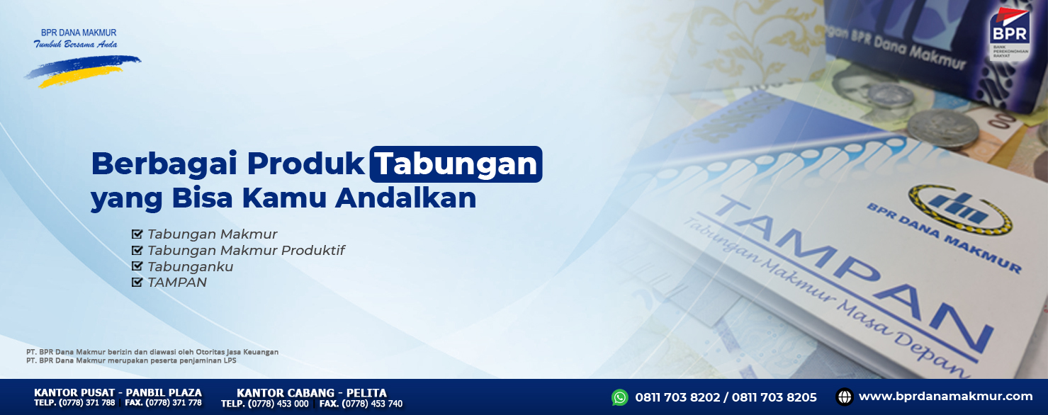 Info SelengkapnyaKami memiliki 4 jenis tabungan yang sesuai untuk Anda, antara lain Tabungan Makmur, Tabungan Makmur Produktif, Tabunganku, dan Tabungan Tampan. Setiap jenis tabungan mempunyai tujuan masing-masing yang berbeda.
